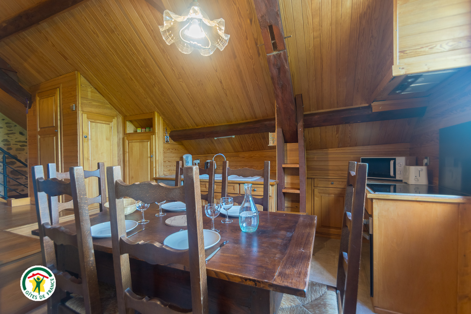 3e verdieping: woonkamer, open keuken, overdekt terras (met uitzicht op het Écrins-massief). De woonkamer heeft een zithoek, televisie, hifi-installatie en elektrische open haard. De keuken is uitgerust met koelkast, vaatwasser, keramische kookplaat, oven, magnetron, plus waterkoker, broodrooster, koffiezetapparaat, barbecue en raclette machine.