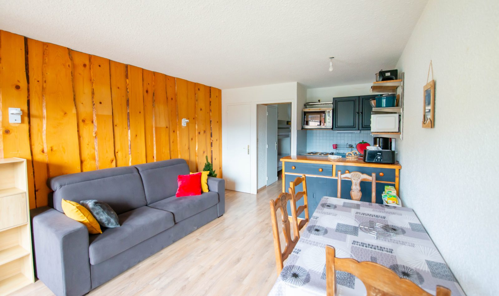 De woonkamer bestaat uit een kitchenette van 18 m², een plek om momenten te delen met familie en vrienden, en een zithoek met een slaapbank. De kitchenette is volledig uitgerust met 4 kookplaten, 1 koelkast met 1 vriezer, 1 oven, 1 magnetron, 1 vaatwasser, 1 fonduestel voor 8 personen, 1 raclettestel voor 4 personen, 1 slacentrifuge, 1 koffiezetapparaat, 1 waterkoker, 1 broodrooster, 1 ruime kast, 3 opbergruimtes en al het servies voor 4 personen (borden, glazen, bestek, enz.).