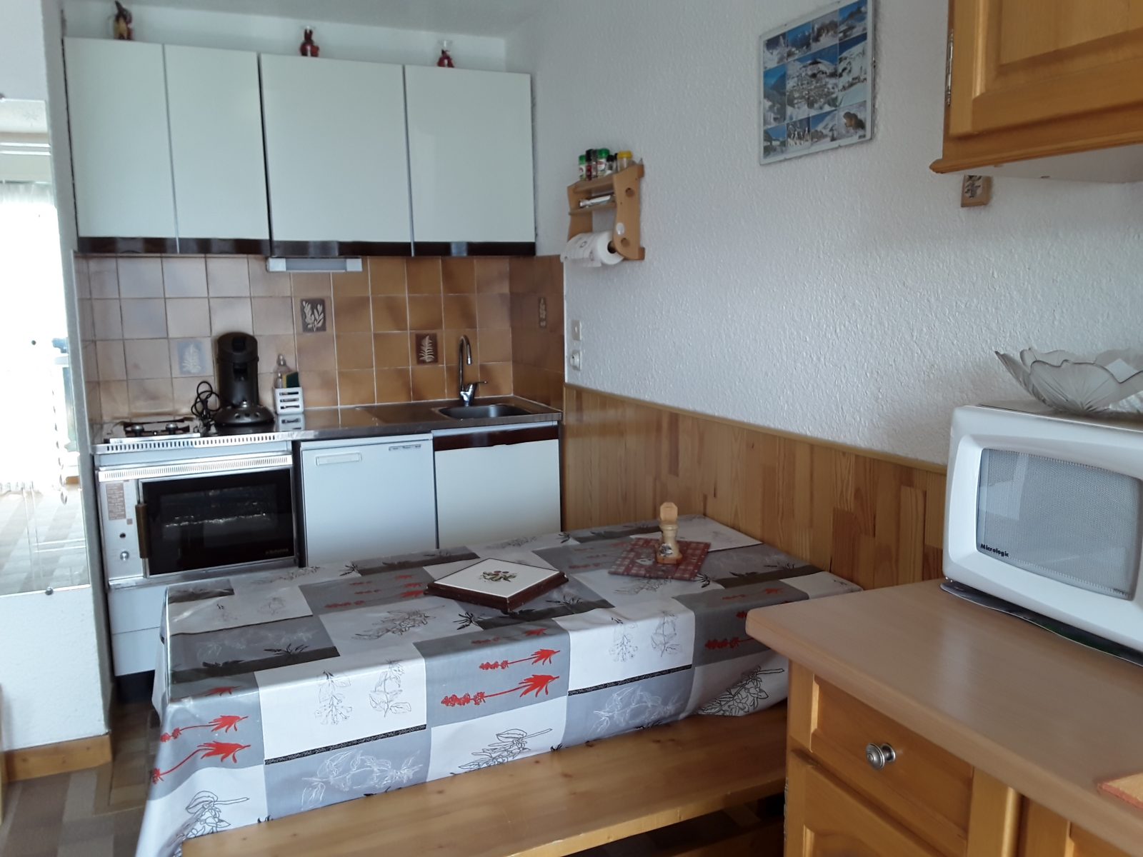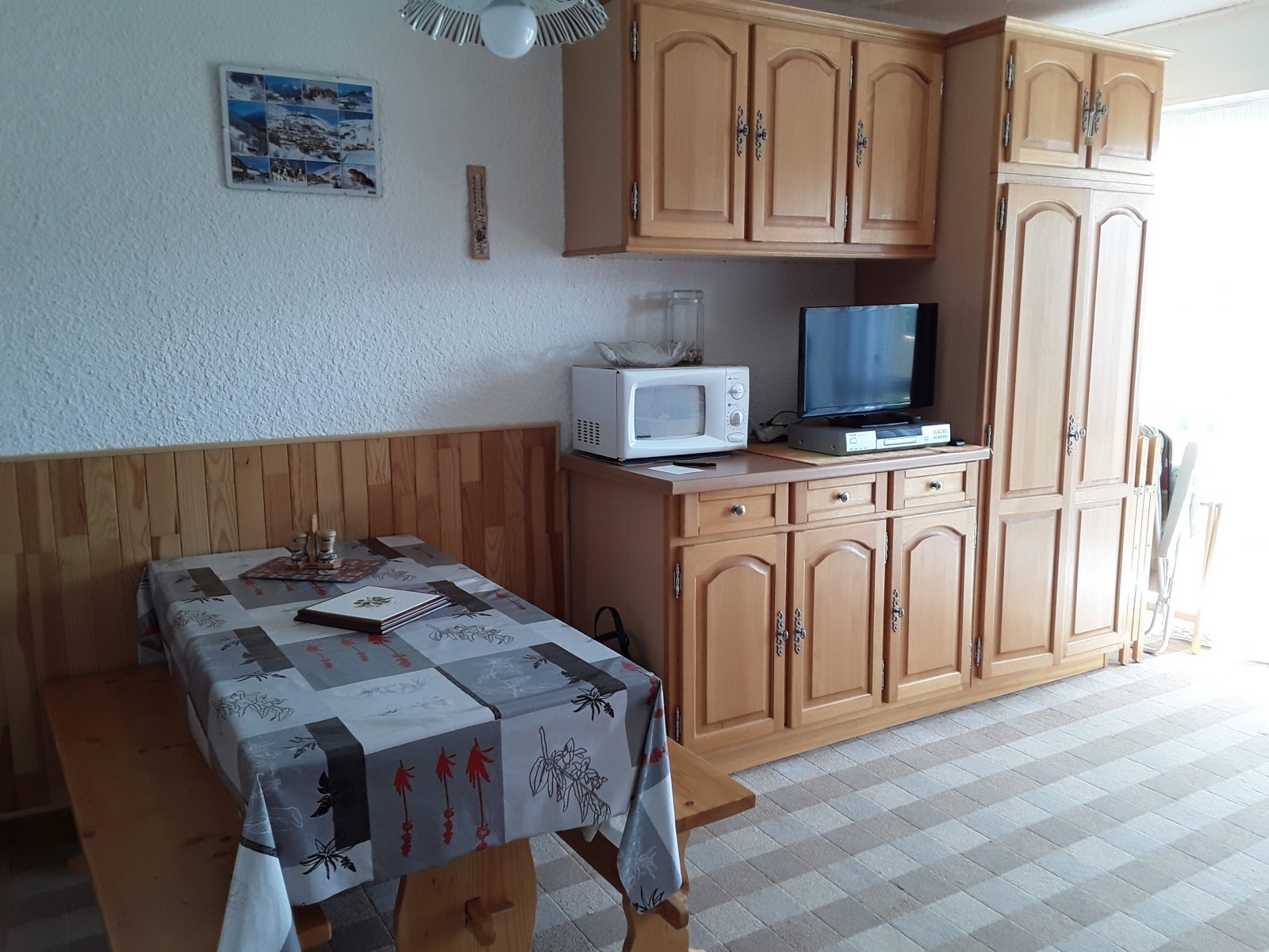 Het heeft een volledig uitgeruste kitchenette (elektrische kookplaat, oven, magnetron, koffiezetapparaat, raclette machine), een eethoek met een lounge/eethoek, en een berggedeelte met twee stapelbedden (dekens, kussens en bolsters aanwezig).